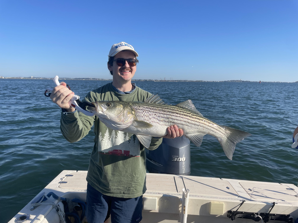Reeled in a massive striped bass while tackling the deep blue seas around Boston!