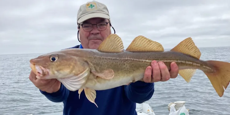 Atlantic cod are the classic New England gamefish. They average 2-4 feet long and can hit 80 pounds, though most we catch are in the 5-20 pound range. Look for them near the bottom in cooler waters, often around rocky structure. Late fall through early spring is prime time. Anglers love cod for their firm, white meat and the solid fight they put up. To land one, we'll usually drift or anchor up and fish near the bottom with clams, squid strips, or jigs. Here's a tip - if you're jigging, a slow lift-and-drop works best. Let it hit bottom, then slowly lift and let it fall. Cod often hit on the drop. Just be ready to set the hook fast - they can be quick strikers. With the rebuilding efforts, we're seeing more cod each year, which is great news for anglers.